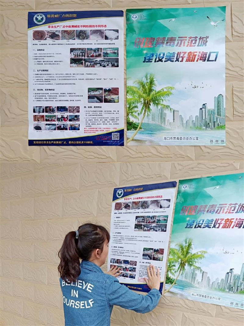 ⬆️禁毒志愿者在企業(yè)門(mén)口粘貼創(chuàng)建全國(guó)禁毒示范城宣傳海報(bào)