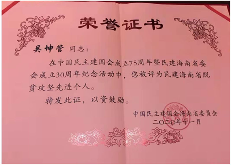 黨的十八大以來,在黨中央堅強領導下,在全黨全國全社會共同努力下,我國脫貧攻堅取得決定性成就,彰顯了中國共產黨領導和我國社會主義制度的政治優(yōu)勢。這些成績的取得,凝聚了全黨全國各族人民智慧和心血,民企也貢獻了自己的力量。 脫貧攻堅是實施鄉(xiāng)村振興戰(zhàn)略的前提和基礎。只有如期實現(xiàn)現(xiàn)行標準下的農村貧困人口全部脫貧,才能實現(xiàn)全面建成小康社會的目標,才能為實施鄉(xiāng)村振興戰(zhàn)略打下堅實基礎。沒有農村貧困地區(qū)如期脫貧,就沒有鄉(xiāng)村振興。脫貧攻堅、擺脫貧困是鄉(xiāng)村振興的基礎和前提、是否能如期打贏脫貧攻堅戰(zhàn),將深刻影響鄉(xiāng)村振興戰(zhàn)略實施的進程。 海南壽南山集團旗下的海南壽南山酒店管理有限公司總經理吳坤管先生在中國民主建國會成立75周年暨民建海南省委會成立30周年紀念活動中被評為 “脫貧攻堅先進個人”,這不僅是對吳坤管先生在脫貧攻堅工作中的肯定,更是對我們海南壽南山集團在履行社會責任與擔當?shù)陌劇?