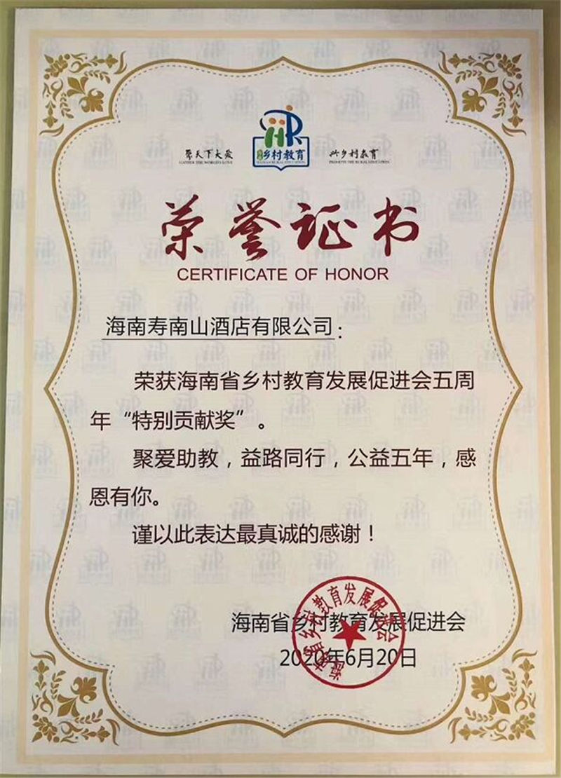 熱烈祝賀海南壽南山集團旗下的海南壽南山酒店有限公司再次榮獲由海南省鄉(xiāng)村教育發(fā)展促進會頒發(fā)的2020年海南省鄉(xiāng)村教育發(fā)展促進五周年“特別貢獻獎”。